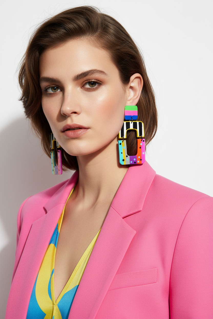 Fabricados en acrílico premium (ese material que es ligero como tus planes de fin de semana pero resistente como tu café del lunes), estos pendientes combinan líneas limpias y formas geométricas con una paleta de colores que refleja el skyline al atardecer. Son el accesorio perfecto para cuando quieres llevar la ciudad puesta sin perder ni un gramo de comodidad.