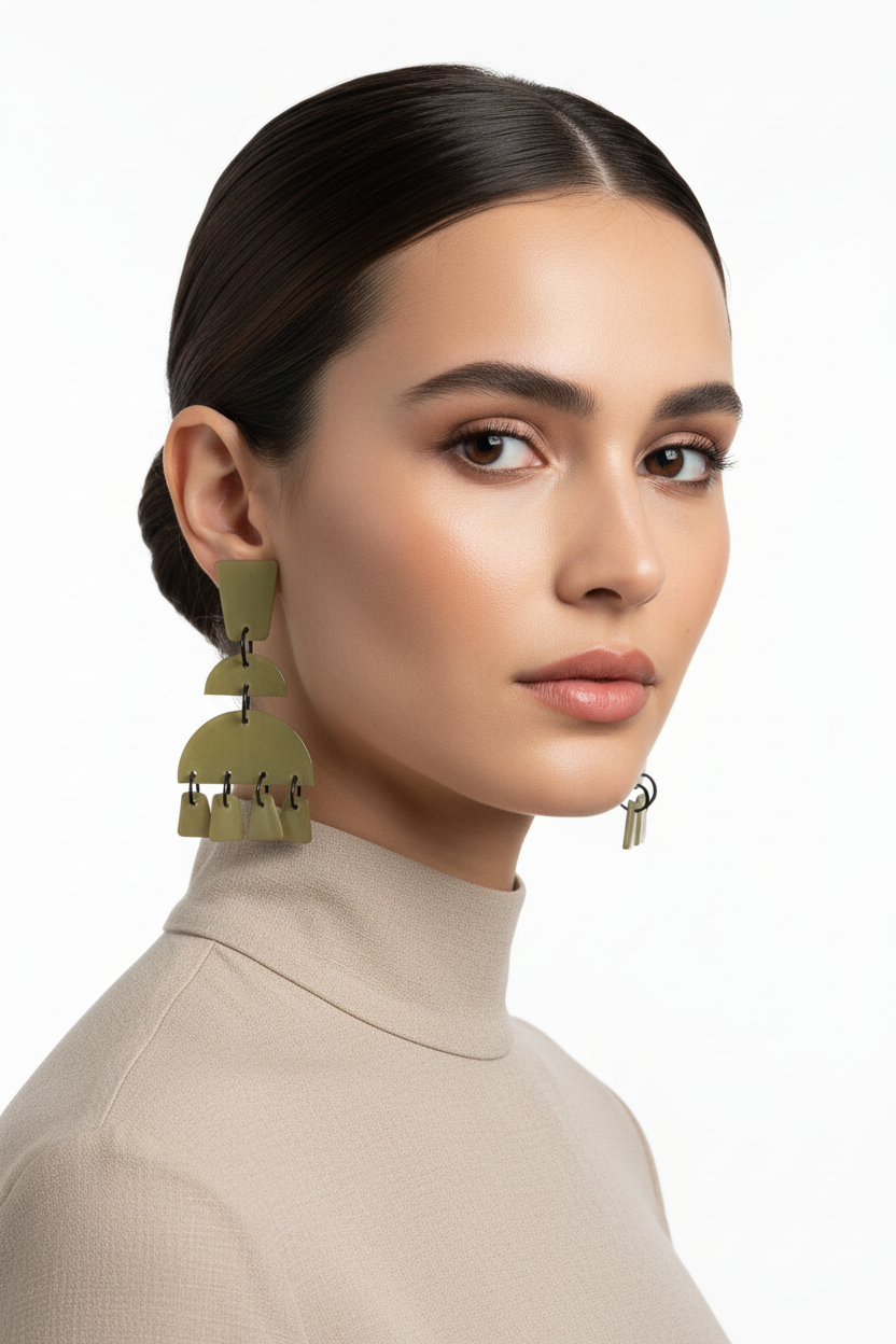 Imagina un rompecabezas de formas que decidió convertirse en joya. Trapecios, semicírculos y mini colgantes que bailan al ritmo de tus pasos, todo en tonos caqui y verde oliva que gritan "soy sofisticada pero también divertida".