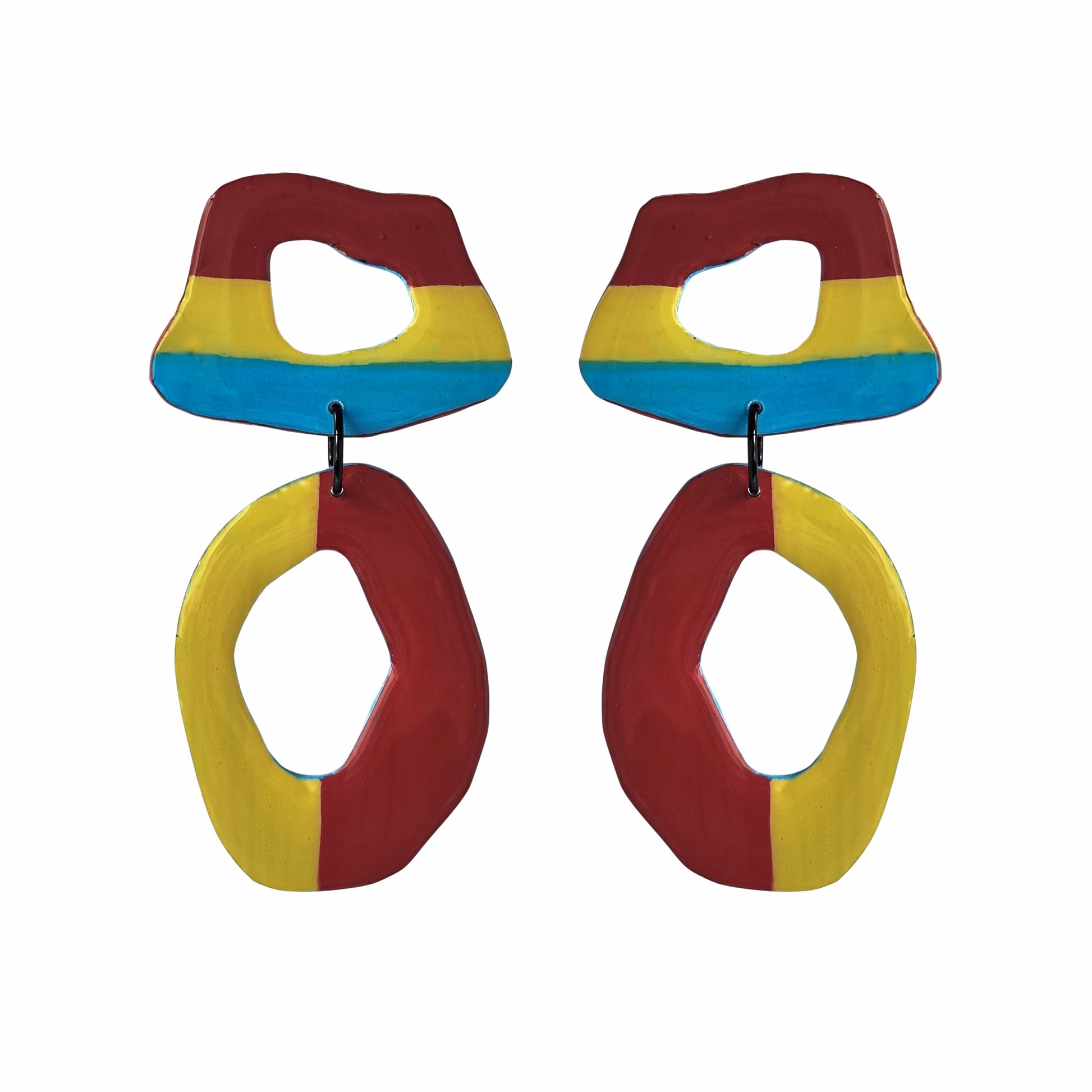Los pendientes LAVRI tricolor granate son una declaración de estilo contemporáneo. Su diseño geométrico de doble pieza combina formas orgánicas con bloques de color vibrantes: granate profundo, amarillo mostaza y azul intenso.