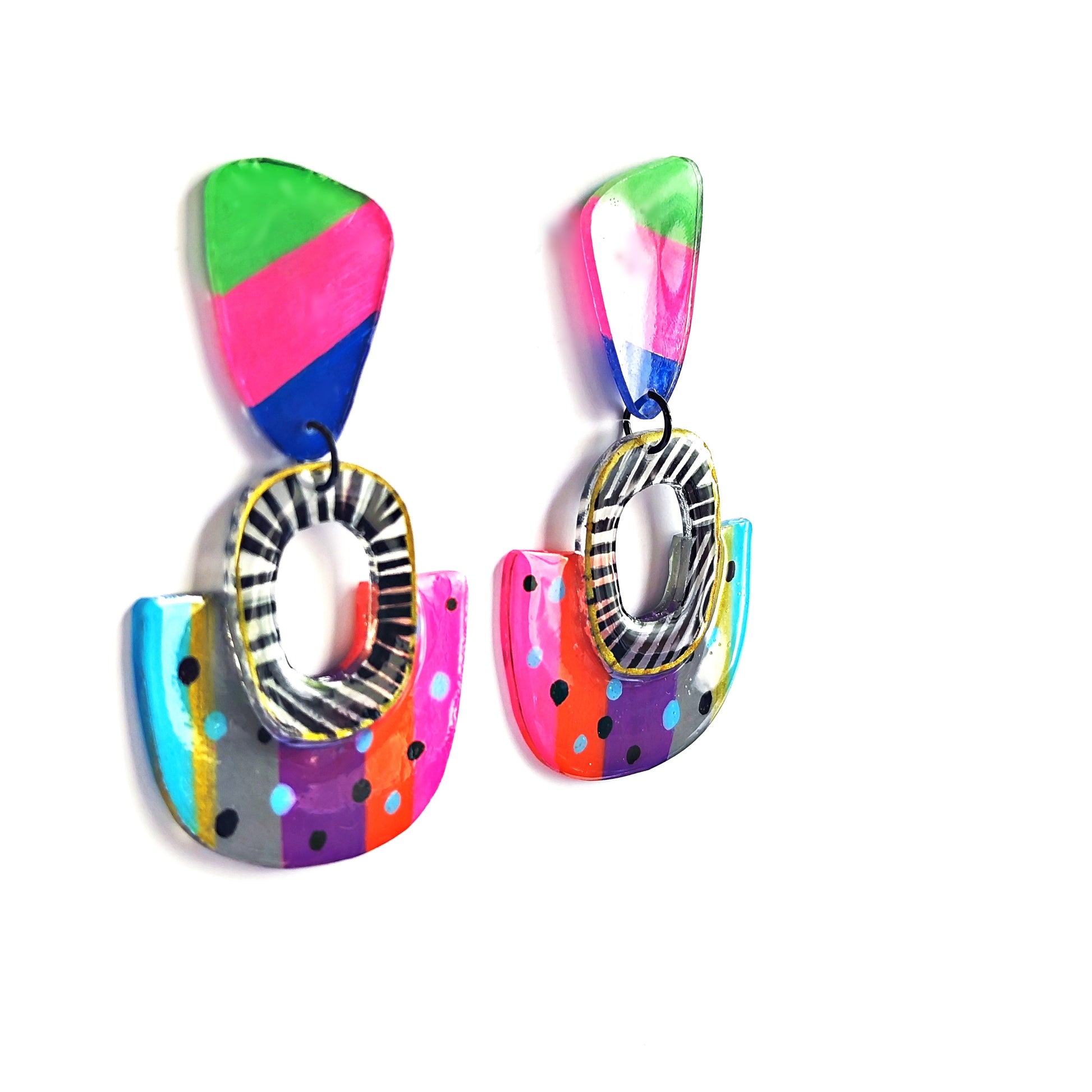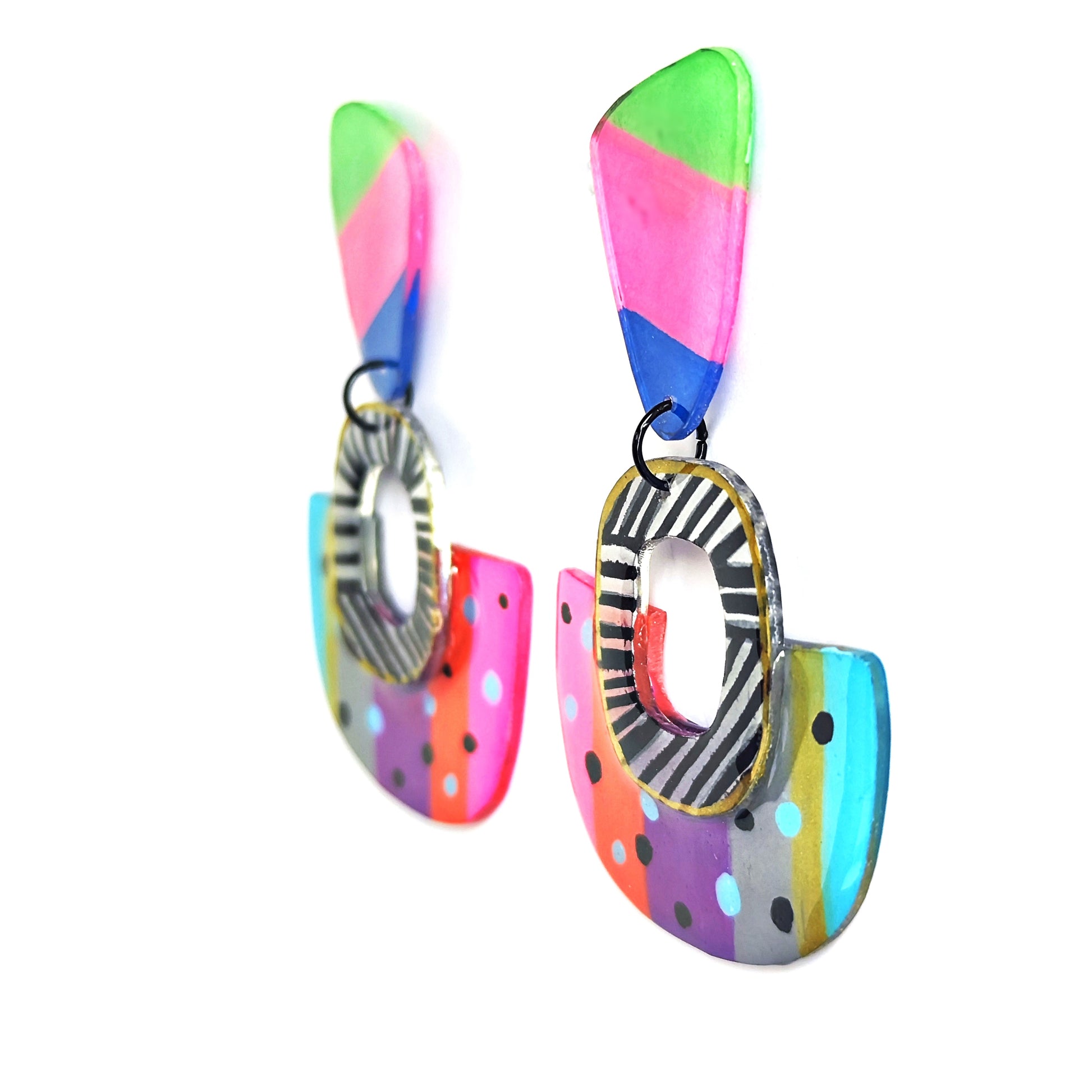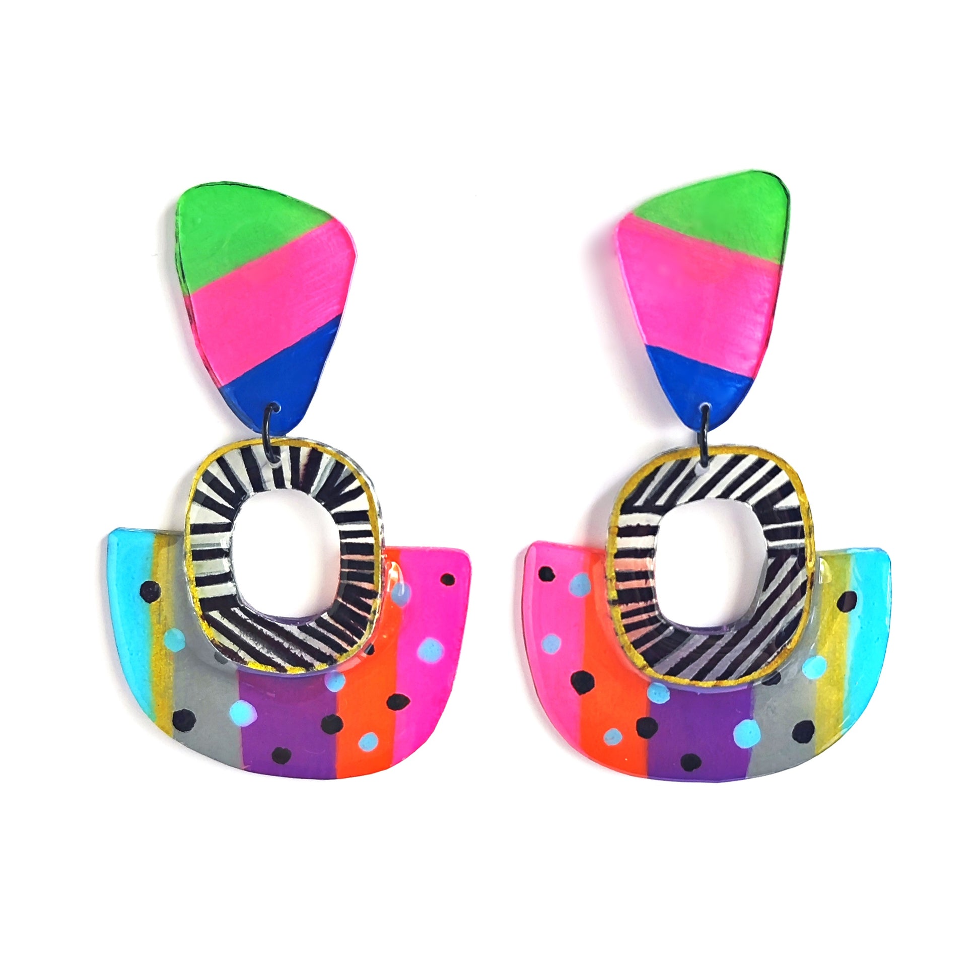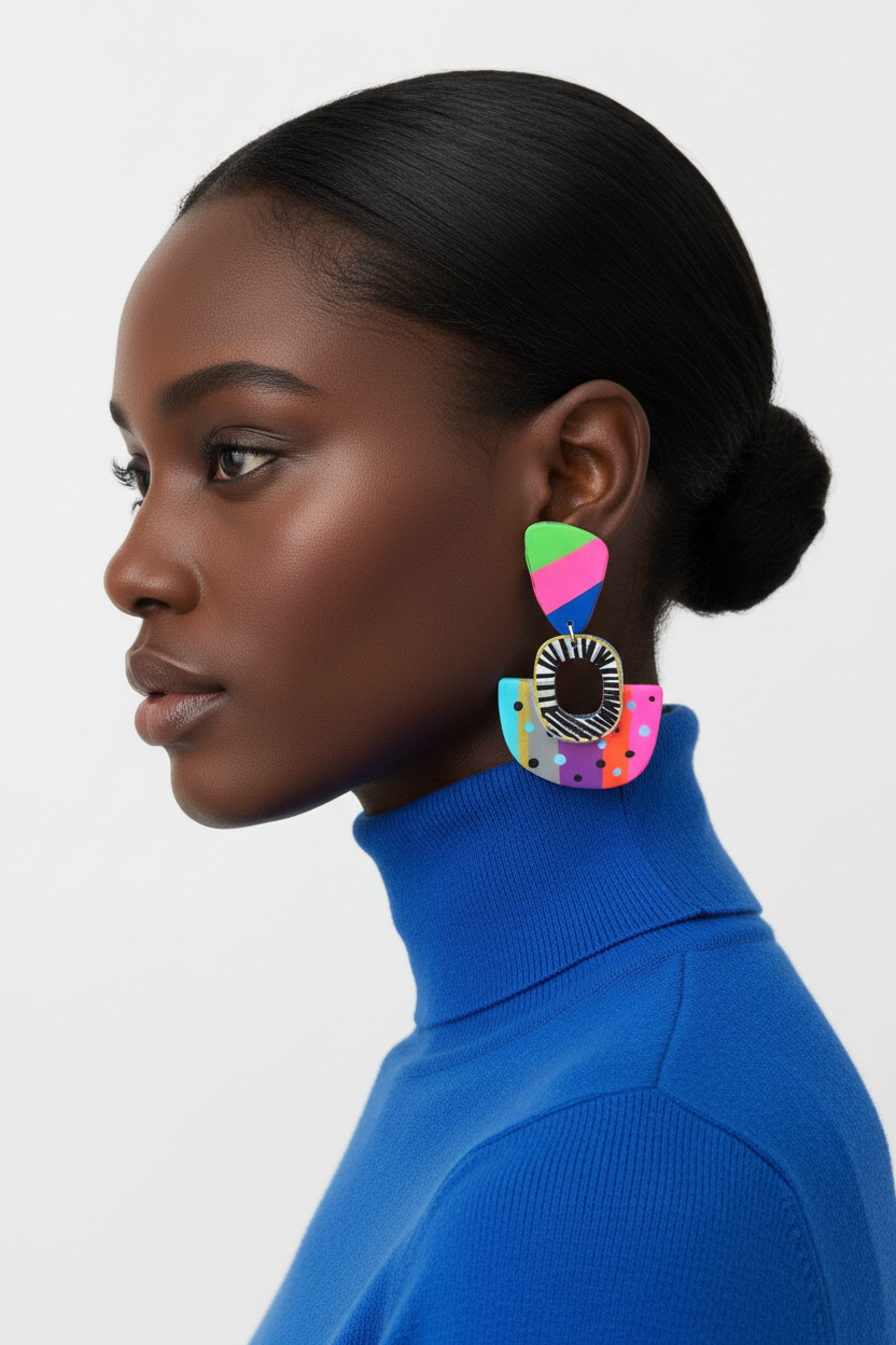 Fabricados en acrílico premium (ese material mágico que es súper ligero pero más resistente que tu playlist de verano), estos pendientes combinan formas geométricas limpias con una paleta de colores que te transporta directamente bajo la sombra de un cocotero. Son el accesorio perfecto para cuando quieres llevar las vacaciones puestas todo el año.
